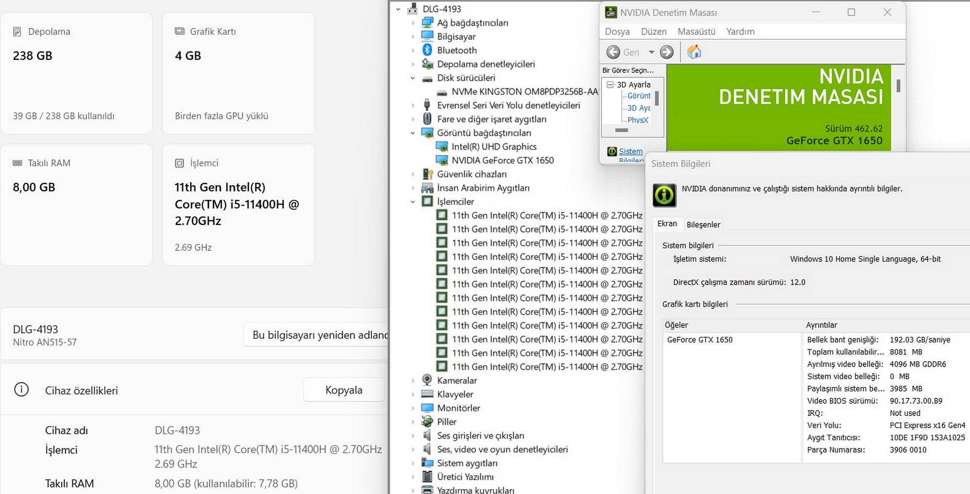 Acer Nitro 5 AN515-57-599V Intel Core i5 11400H 8GB RAM 256GB SSD GTX1650 15.6” FHD 144Hz NH.QEKEY.004 (İKİNCİ EL)
