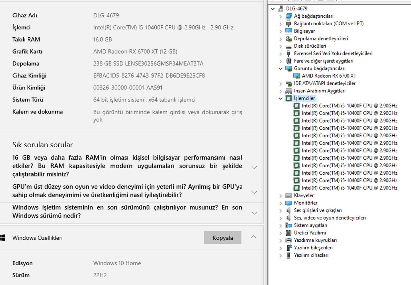 İşlemci: Intel Core i5-10400F, 6 Çekirdek