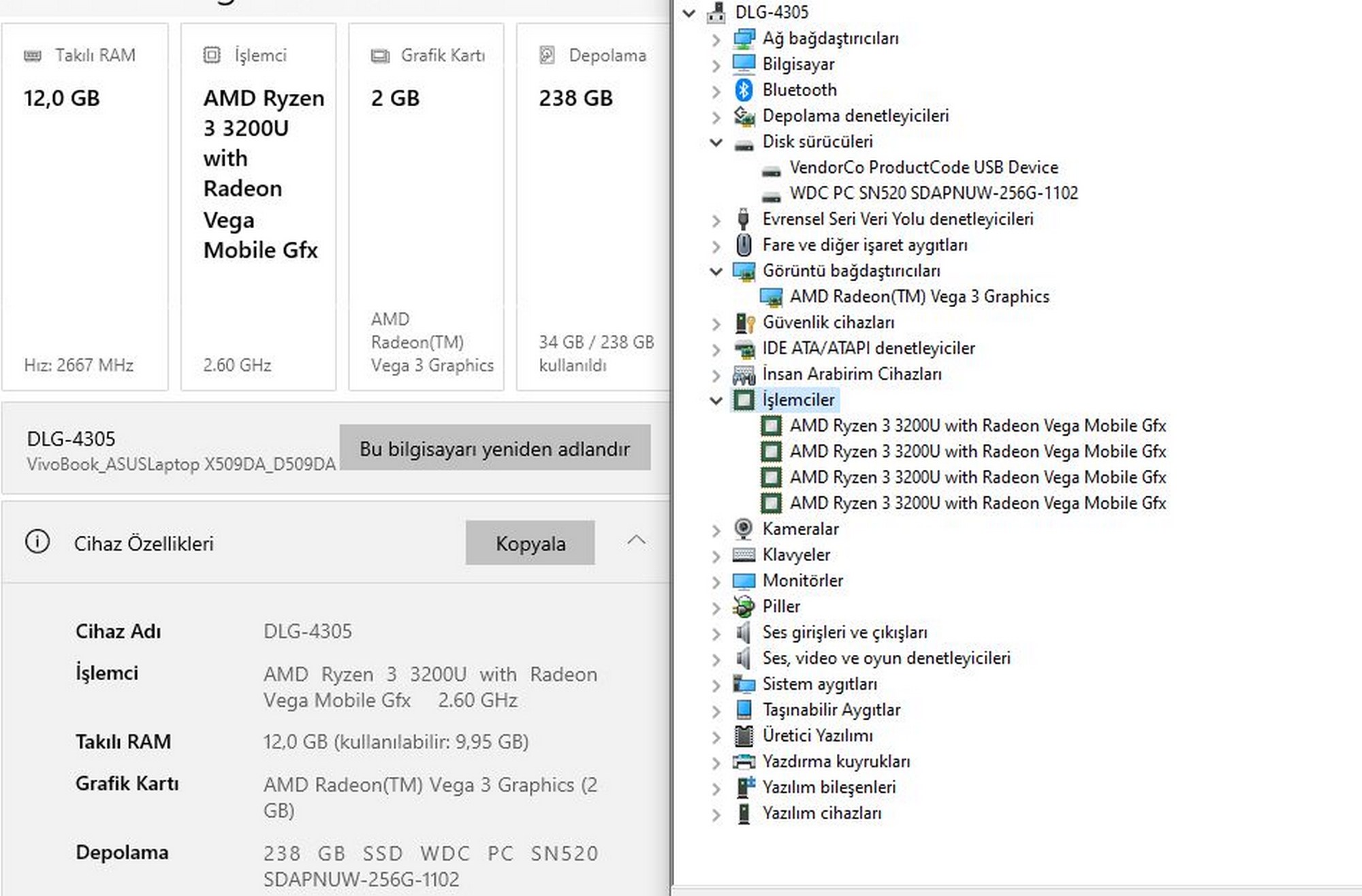 Asus D509DA-BR129T AMD Ryzen 3 3200U 12GB RAM 256GB SSD 15.6” HD (İKİNCİ EL)