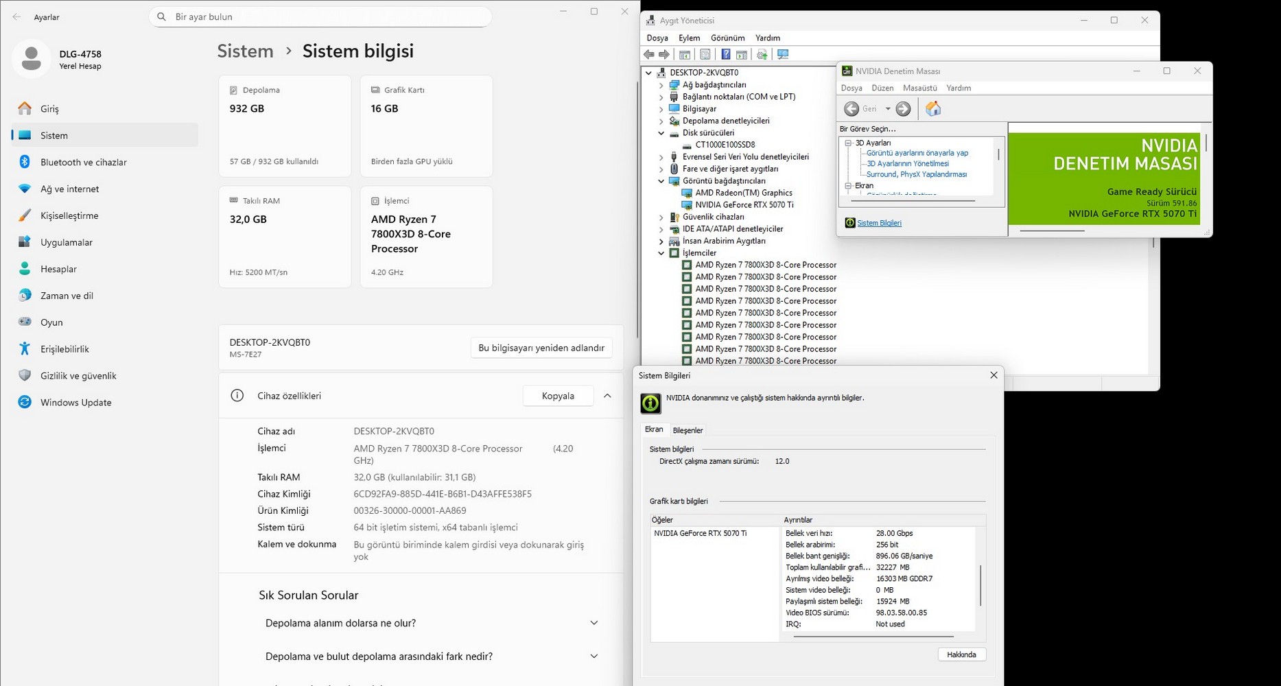 Asus R7-7800x3D 32GB 1TB RTX5070Ti 16GB W11 Pro OEM Oyuncu Kasası