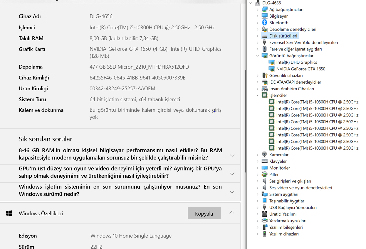 İşlemci: Intel Core i5-10300H 4 çekirdek
