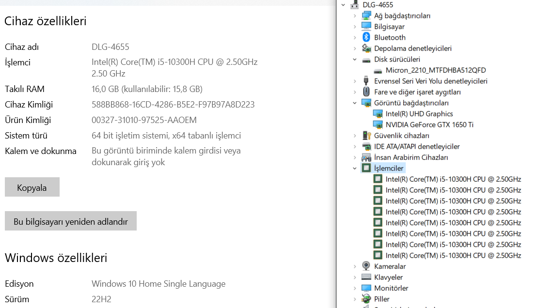 İşlemci: Intel Core i5-10300H 4 çekirdek