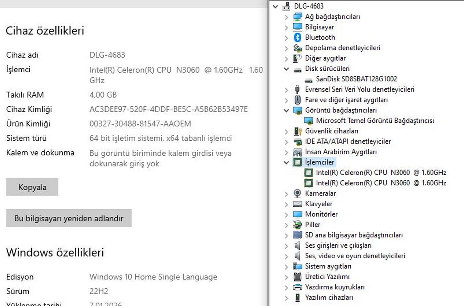 Ekran Kartı: Intel HD Graphics Paylaşımlı