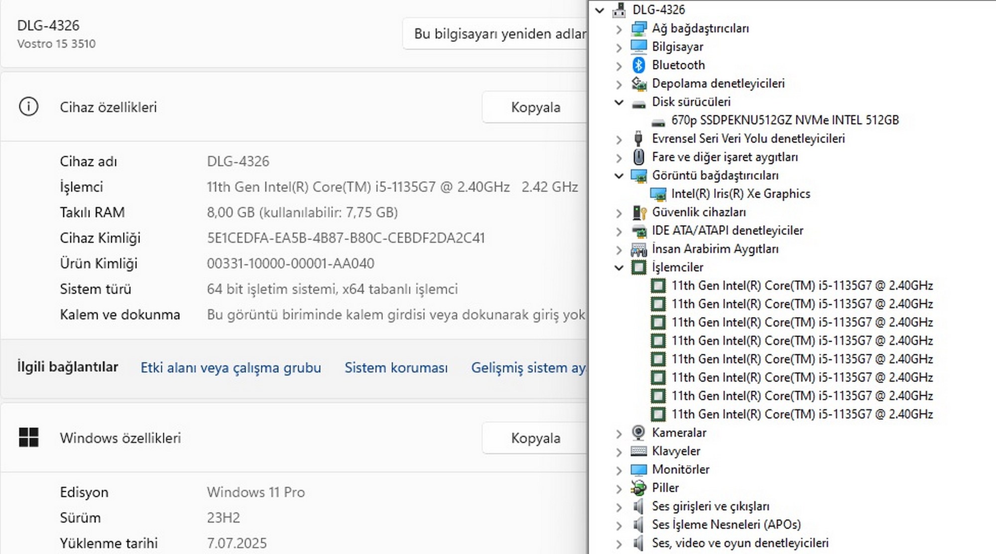 Dell Vostro 15 3510 Intel Core i5 1135G7 8GB RAM 512GB SSD W10 15.6” FHD (İKİNCİ EL)