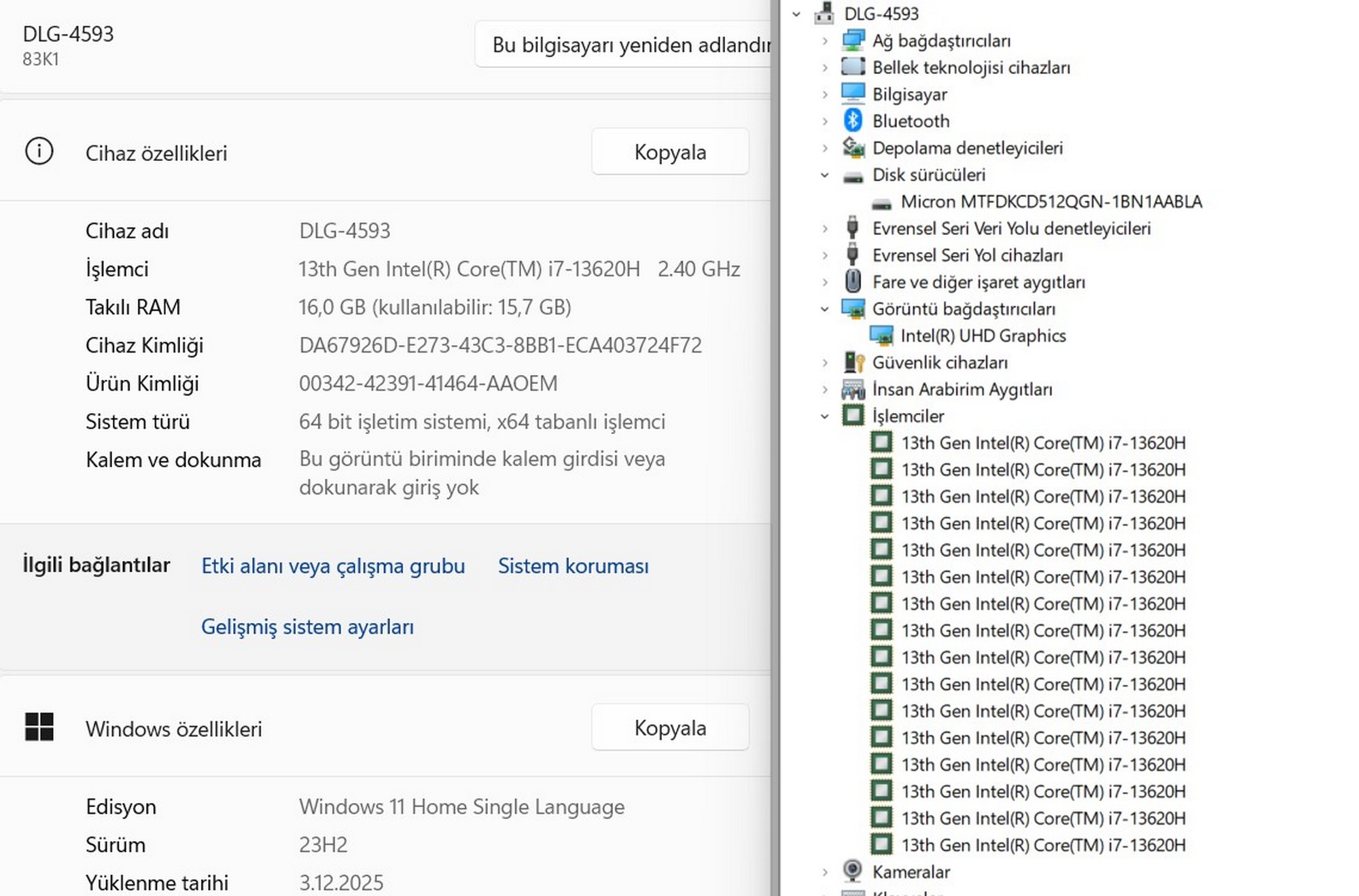 İşlemci: Intel® Core™ i7‑13620H 10 çekirdekli