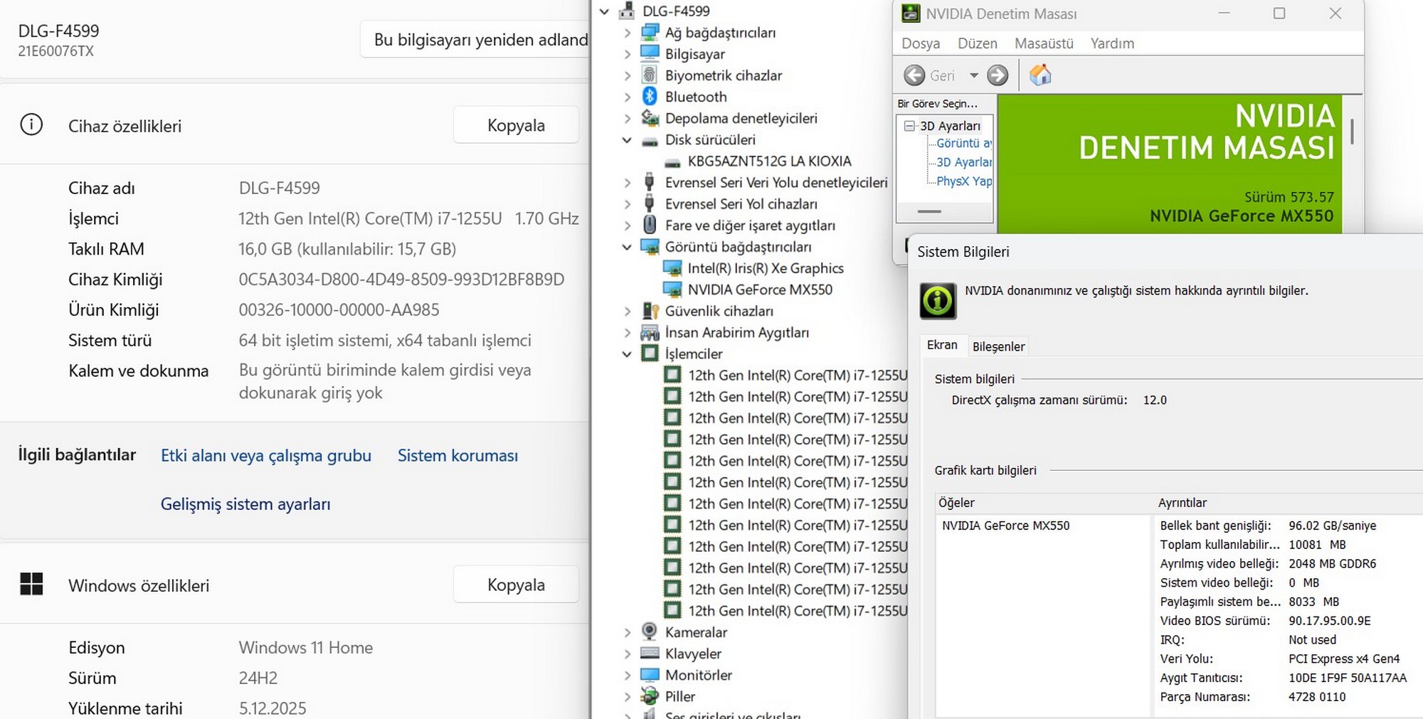 Ekran Kartı: NVIDIA GeForce MX550 2 GB GDDR6