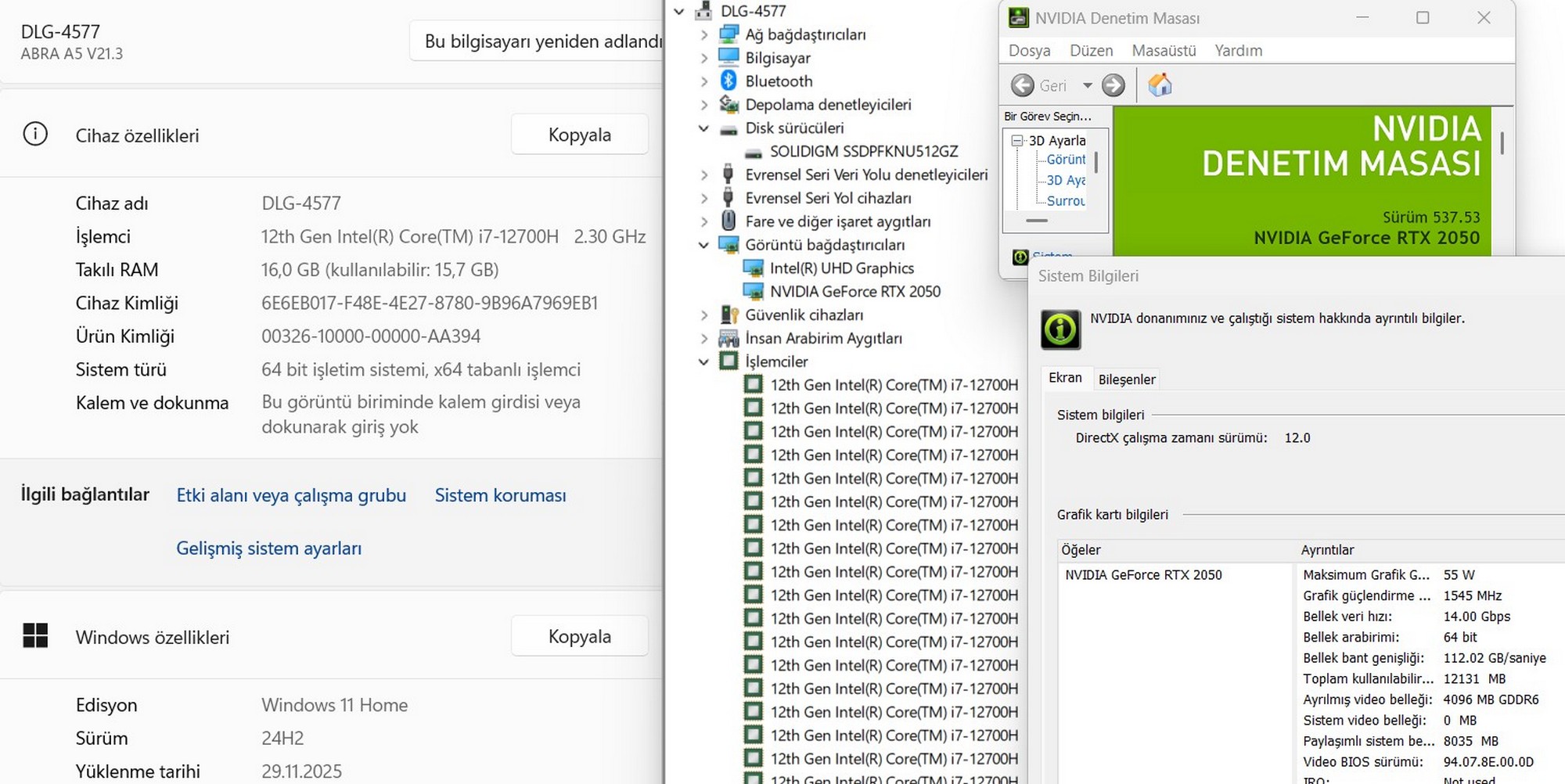 Ekran Kartı: NVIDIA GeForce RTX 2050 Max‑P 4 GB GDDR6 VRAM