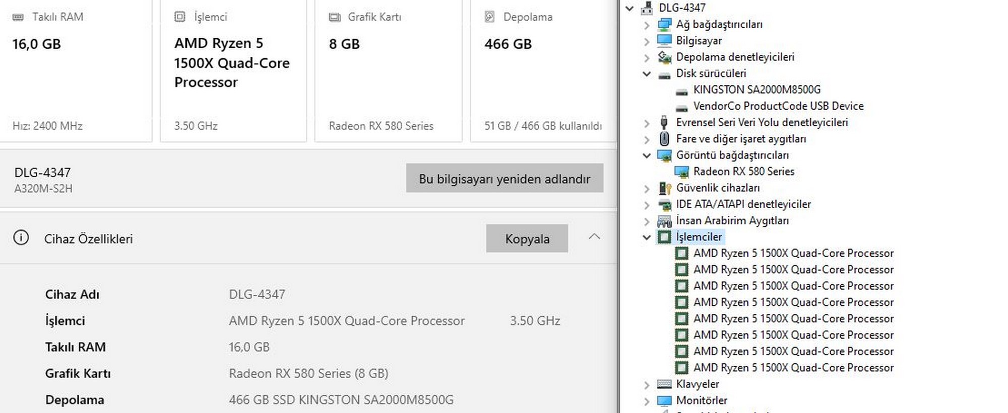 İşlemci: AMD Ryzen 5 1500X, 4 çekirdek